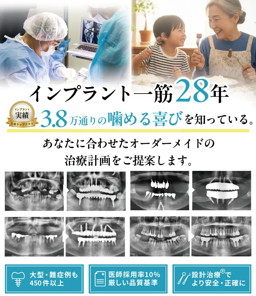 一般の歯科医院では、インプラント以外の治療も行っているため、インプラント専門の医院よりもインプラント施術の可能性は低くなります。当医院はインプラントに特化した専門の歯科医院として、日々の患者様からの様々なご相談にインプラント医師がお応えすることで、累計38,038本の施術を行いました。